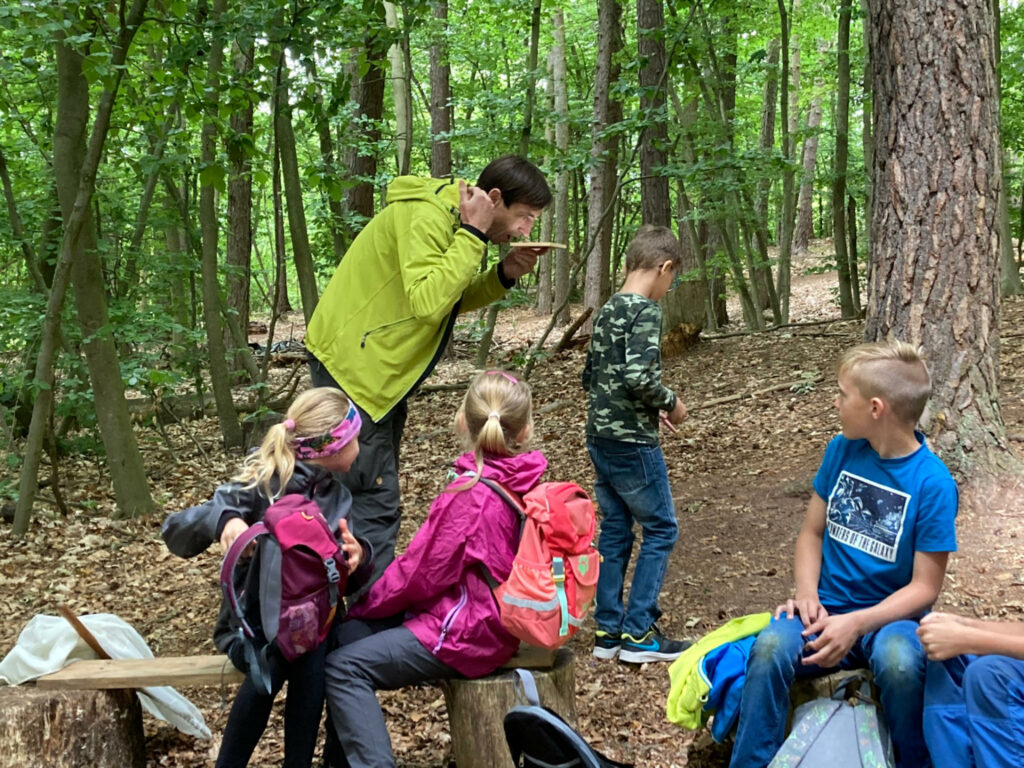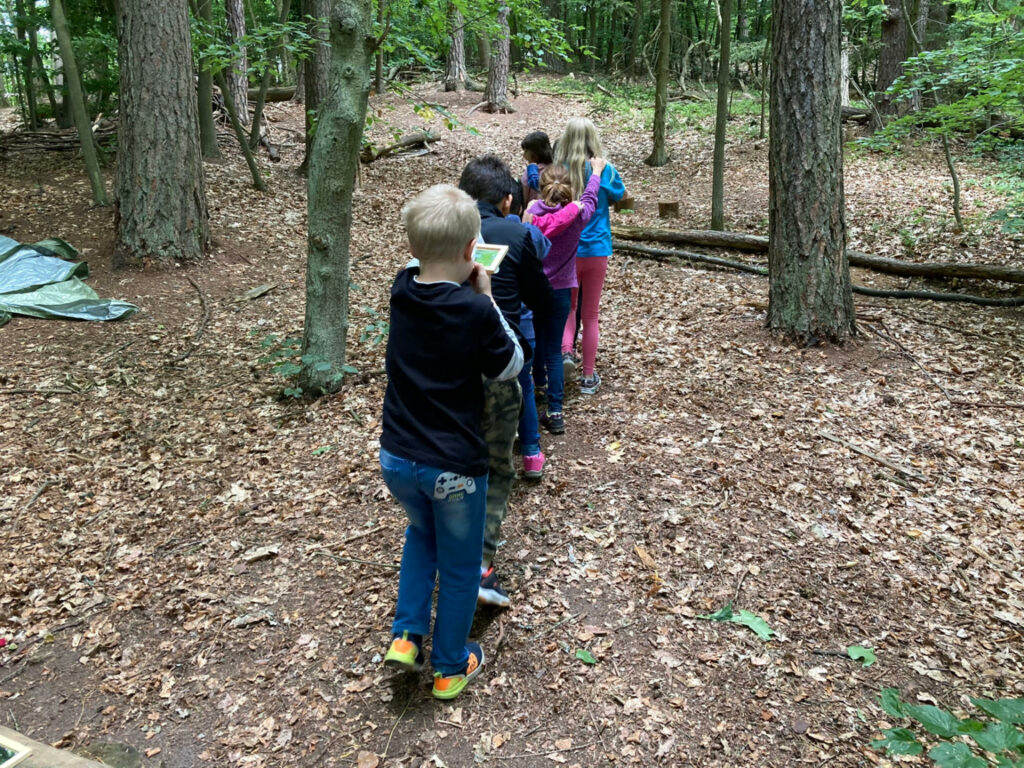 Ob beim Fledermausspiel oder mit Spiegeln ausgerüstet, um die Baumkronen zu bewundern – die Kinder waren mit Feuereifer bei der Sache. Natur erleben, die Düfte des Waldes aufsaugen und den Wald mit allen Sinnen erfahren – das durften die Kinder am Walderlebnistag erleben.